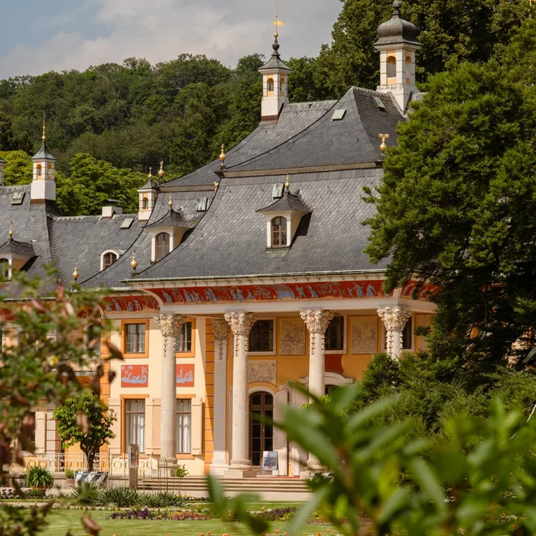 Das barocke Schlossensemble mit seiner eindrucksvollen Gartenanlage vereint chinesische Architektur mit europäischem Rokoko. Es begeistert mit filigranen Details, kunstvollen Pavillons und weitem Blick auf die Elbe.